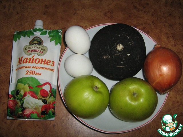 Подготовить ингредиенты для салата: черную редьку, 2 яйца, 2 зеленых яблока, 1 репчатую луковицу среднего размера; майонез белого цвета.
