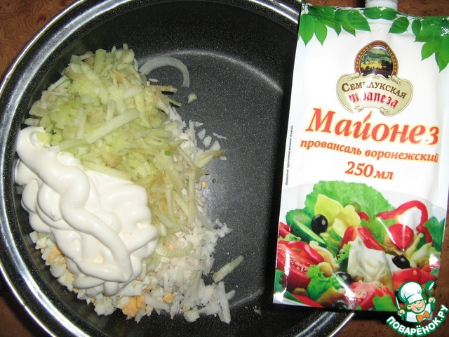 Для заправки подготовить майонез. Для заправки салата рекомендуется майонез белого цвета, например, "Провансаль Воронежский среднекалорийный. Семилукская трапеза".