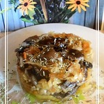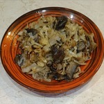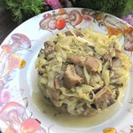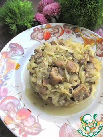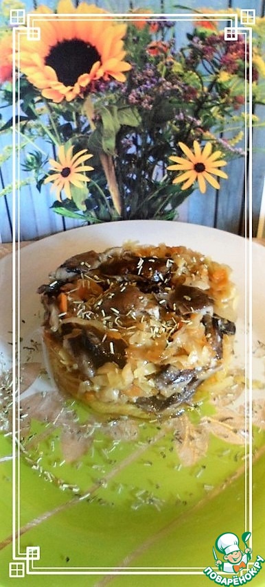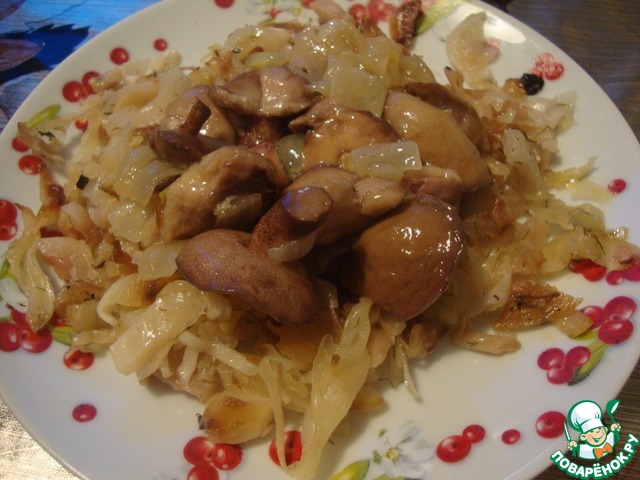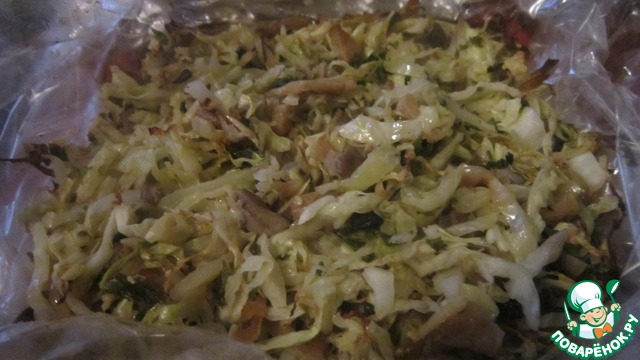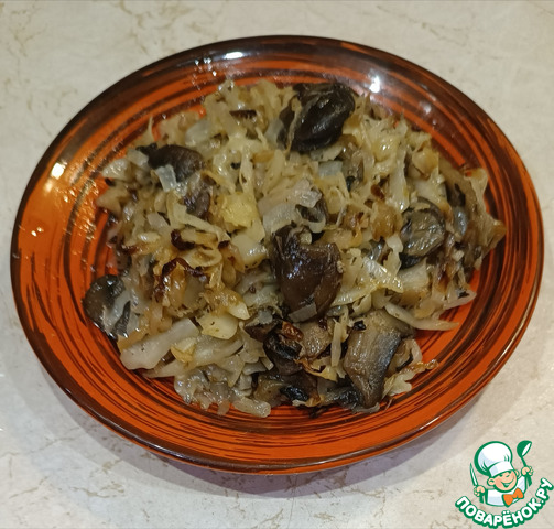 Форму с капустой вынуть из духовки. Аккуратно отрезать один кончик рукава (осторожно, не обожгитесь паром!), взять рукав за второй кончик и выложить капусту в форму. Добавить лук с грибами, перемешать и поставить форму в духовку ещё на 3-5 минуты. (для того, что все ингредиенты окончательно "подружились" между собой)