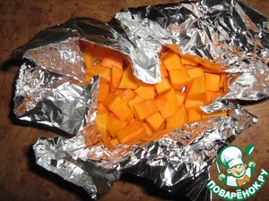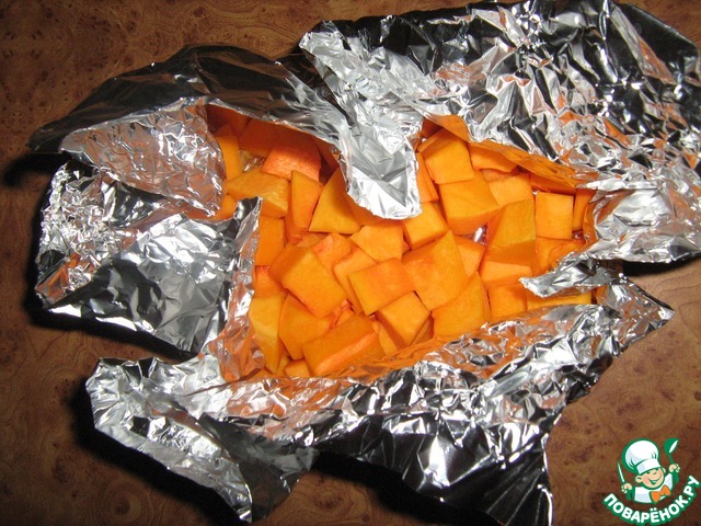 Сначала приготовить начинку: Тыкву почистить, нарезать кубиком, запечь 40 мин в фольге при 180 градусах до мягкости.