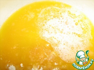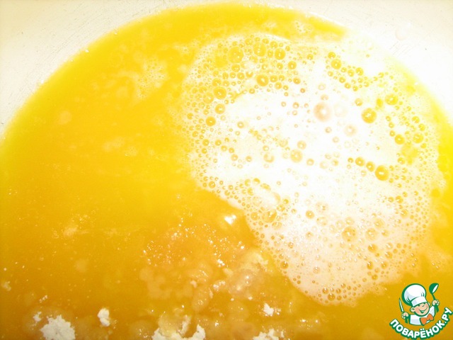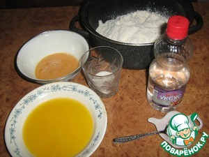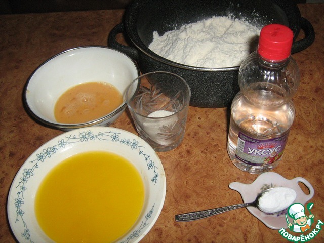 Подготовить для теста яйца, соду, уксус, растопленный в микроволновой печи маргарин, сахар, муку.