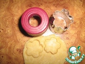 Вторую часть теста раскатать в тонкий пласт, формочками и специальным ножом вырезать "цветы и листики".