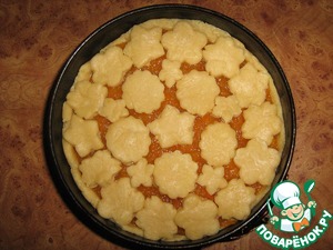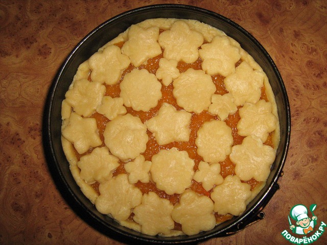 Рецепт выпечки с тыквой. На этот раз – это песочный пирог. Для начинки подойдут: густое варенье, повидло, мармелад, джем, творог. Я запекла в духовке и потолкла в пюре тыкву. Очень вкусно. Рецепт пирога удачный – один из моих коронных. Согласно оригинальному рецепту тесто делится на две части: одна часть теста замешивается покруче и выдерживается в морозилке, потом натирается на крупной терке сверху на начинку слоем; другой частью выстилается дно и стенки формы, создавая бортики. Испеченное остывшее изделие посыпается через сито сахарной пудрой. Я же располагала свободным временем и решила создать красоту: тесто разделила на 2 части, одну часть выложила на дно формы, а из второй части вырезала формочками «цветы» и «листики» и украсила ими пирог, укладывая внахлест, закрывая полностью начинку и формируя рисунок – «букет роз с листьями». Готовый остывший пирог посыпала слегка сахарной пудрой, которая создала эффект «снега на розах». Теперь подробно…