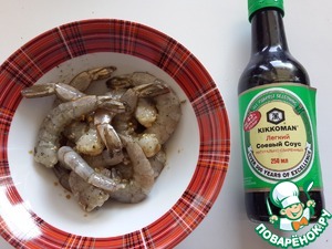 Креветки посыпьте смесью специй и приправьте соевым соусом, оставьте на 15 минут.
