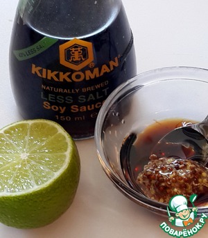 Для заправки смешайте соевый соус, горчицу, сок лайма и масло.