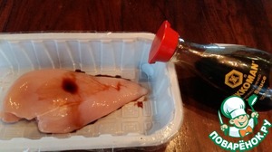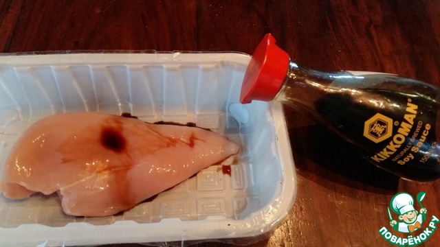 Куриную грудку замариновать в соевом соусе от ТМ "Киккоман". У меня мариновалась 3 часа.