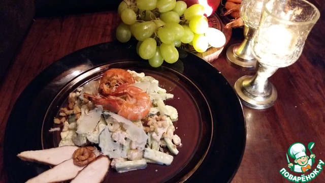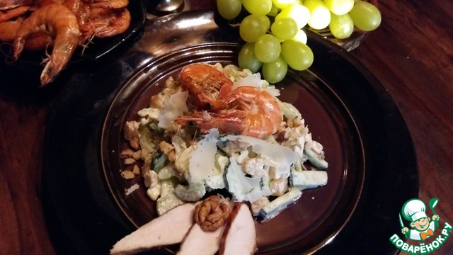 А это более праздничный вариант. Грецкие орехи слегка подсушить на сковородке, измельчить и вместе с тонкими листочками пармезана использовать для украшения салата. Из двух целых креветок выложить сердечко. Сбоку расположить несколько ломтиков куриного филе.