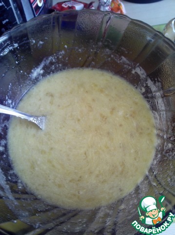 Добавить сухие иингредиенты к бананам и сахару, хорошо вымешать.