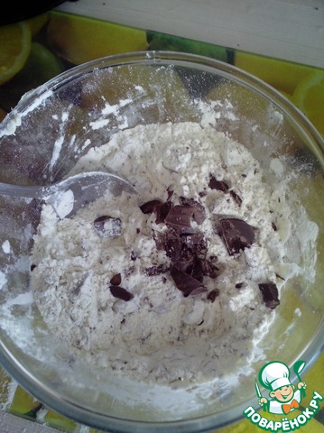 Сухие ингредиенты-муку, соль, разрыхлитель, растворимый кофе, шоколад- смешать.