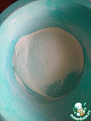 В одной миске смешиваем все ингредиенты (мука, крахмал, сахарная пудра, разрыхлитель (или сода, гашенная уксусом) и соль и, обязательно, просеиваем их 3 раза