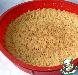 Выложить тесто в форму, формируя бортики (у меня силиконовая Д=25 см). Наколоть вилкой, застелить сверху бумагой для выпечки и положить груз (специальные шарики или любые бобовые). Выпекать при 180 градусах 30 мин. Я груз не положила, поэтому мой корж не ровный, а немного бугристый. Но, конечно, под кремом это не будет видно.