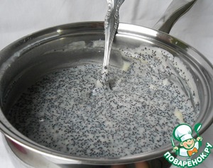 В загустевший крем добавить мак. Крем достаточно густой, поэтому мак можно добавить вместе с оставшимся невпитавшимся молоком. Вернуть крем на огонь и проварить еще 3-5 мин. Оставить остывать.