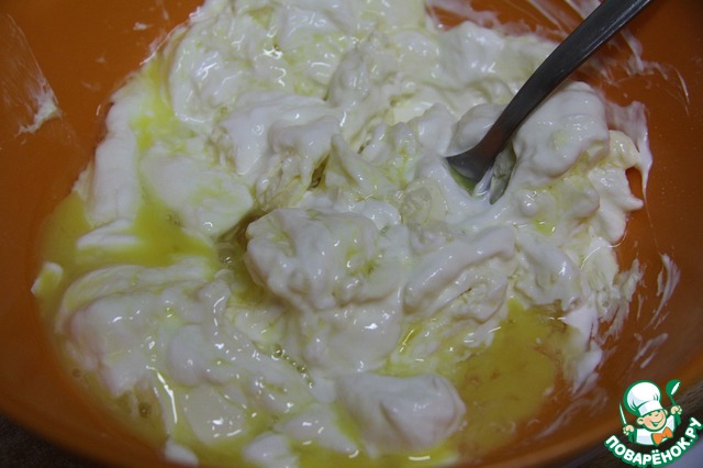 Смешать масло, сметану и яйцо. Размешать. Можно использовать и охлажденное масло, натерев его на крупной терке.
