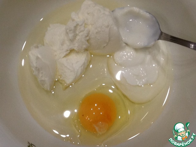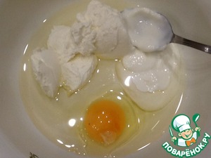 Начнем готовить тесто. Смешаем в отдельной миске все жидкие ингредиенты. 150 г творога, 60 г сметаны, 60 г растительного масла без запаха, 1 яйцо. Просто смешаем ложкой.