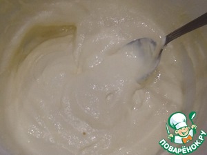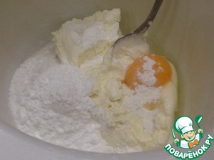 Для крема опять же просто ложкой (ничего не надо взбивать), ну можно венчиком при желании, смешиваем все составляющие для крема: 400 г мягкого пастообразного творога, 1 яйцо, 75 г сахарной пудры, ваниль (у меня эссенция), 2 ст. л. крахмала кукурузного.