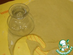 Тесто раскатываем (мне понадобилось чуть добавить муки, иначе липло) и вырезаем кружочки. Тесто мягкое, легко рвется - будьте аккуратны! Чтобы кружочки закрыли стенки наших формочек (у меня силиконовые для маффинов/кексов), их диаметр должен быть больше в 2 раза, чем их донышко. У меня такой совет сработал - проверьте его и вы!