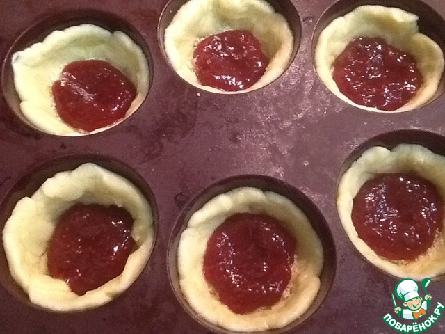 Кладем по чайной ложке джема. У меня самодельный клубничный, вы можете взять любой любимый.