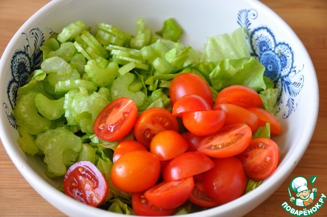 Листья салата рвём или режем произвольно. Стебель сельдерея режем поперёк полосками. Помидоры черри режем пополам. -