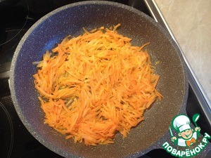 Трем на крупной терке морковь и обжариваем ее вместе с тремя столовыми ложками масла на среднем огне минуты 2-3, помешивая.