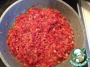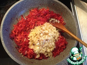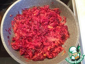 На крупной терке трем свеклу (которую заранее отварили до полу готовности и остудили), добавляем к моркови, перемешиваем, накрываем крышкой, убавляем огонь и тушим минут 10-15, периодически помешивая.