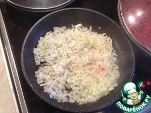 Мелко режем лук и обжариваем его на другой сковороде с двумя столовыми ложками масла на среднем огне почти до готовности. В конце добавляем к луку чеснок, пропущенный через пресс и перемешиваем.