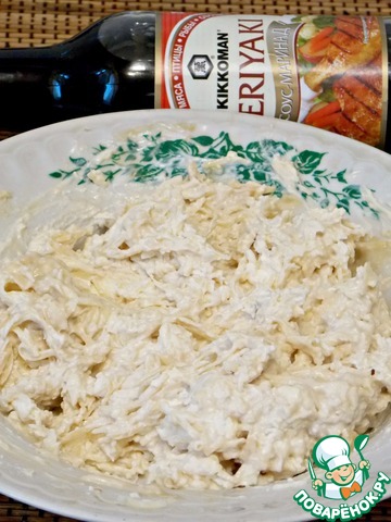Сыр и чеснок натереть на мелкой терке, добавить соевый соус ТМ " Kikkoman" творог и майонез. Перемешать до однородной массы.