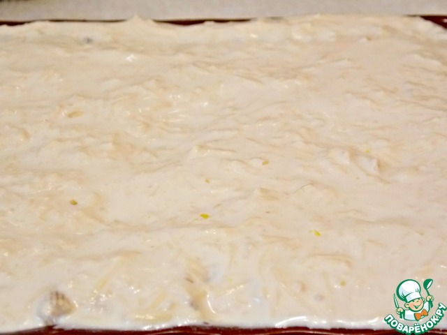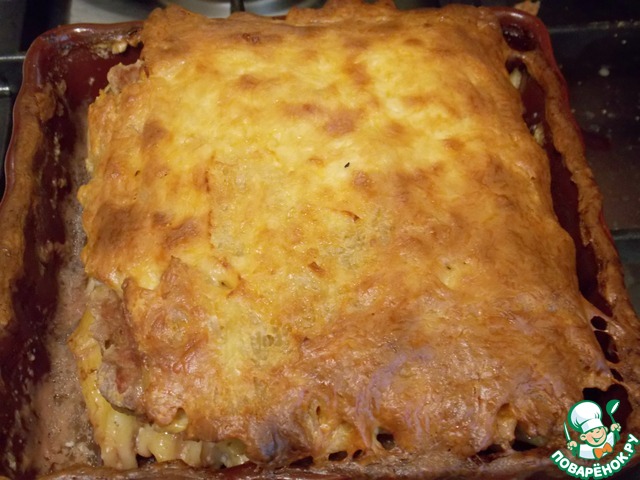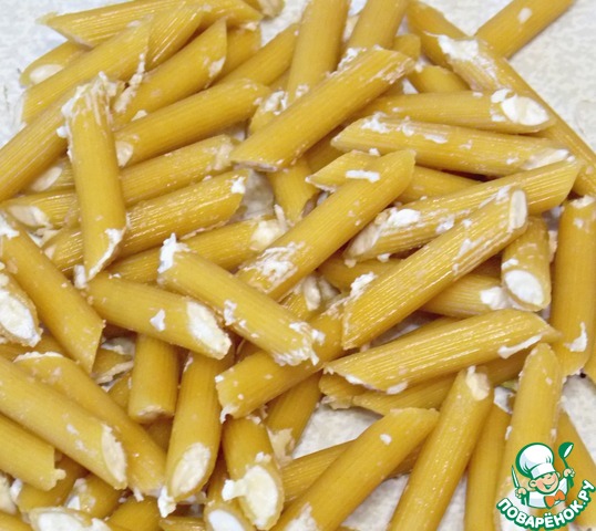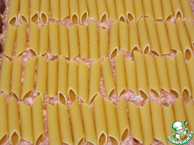 Оставшуюся начинку развести водой до жидкого состояния и залить ею макароны. Поставить в противень с водой и в духовку при t= 180.