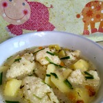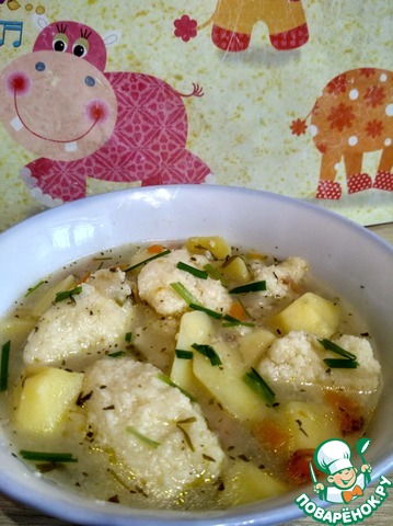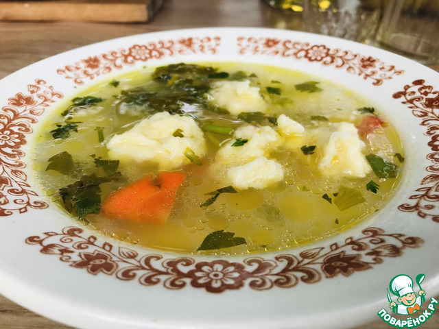 Как сварятся голени, закидываем картофель, даем ему покипеть. Добавляем зажарку, варим еще минут 5. Делаем клецки чайной ложечкой и сразу же опускаем их в суп. Заправляем зеленью, даем закипеть и можно выключать.