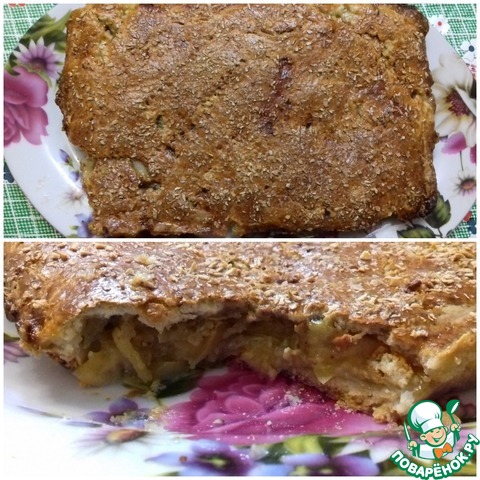 Вторую половину также раскатать в пласт и накрыть им начинку, края прижать пальцами. Яйцо взбить вилкой, смазать им пирог и наколоть поверхность вилкой. Выпекать пирог в разогретой духовке при температуре 180 градусов примерно 30-40 минут.