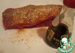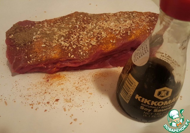 Запечь говядину. Я использовала при запекании в качестве специй соевый соус Классический ТМ Киккоман, кориандр, куркуму, чесночный порошок, сушёный лук и оливковое масло. Натереть мясо специями, завернуть в пергамент и фольгу и запечь.