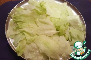 Листы салата порвать руками на условные квадраты и выложить на тарелки для подачи.