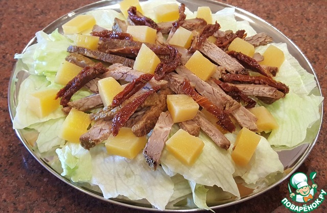 Нарезать запечённое мясо соломкой и выложить на тарелку, сверху добавить несколько кусочков маринованной тыквы. Нарезать вяленые помидоры тонкой соломкой и выложить на тарелку.