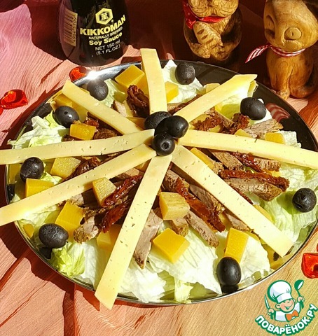 Нарезать полосочками сыр, выложить солнышком и добавить по вкусу маслины. Салат готов! Приятного Вам аппетита!