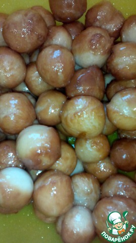 Масло разогреть во фритюрнице (у меня сковорода). Руки хорошо смазываем раст. маслом. От теста отрываем маленькие кусочки (размером с грецкий орех), скатываем в шарик и обжариваем с двух сторон.