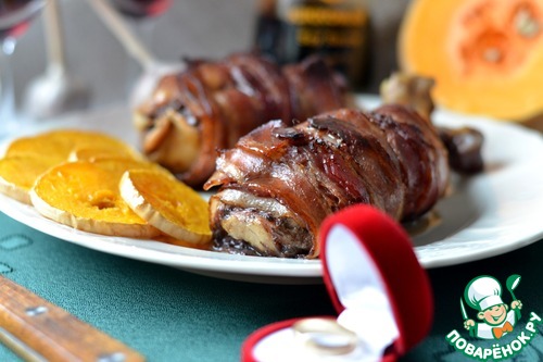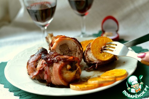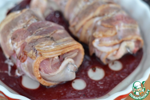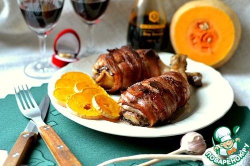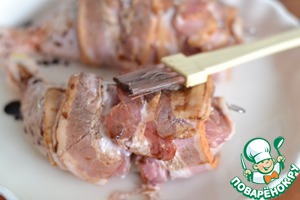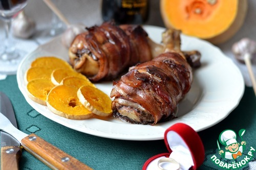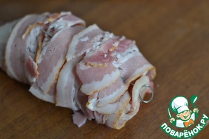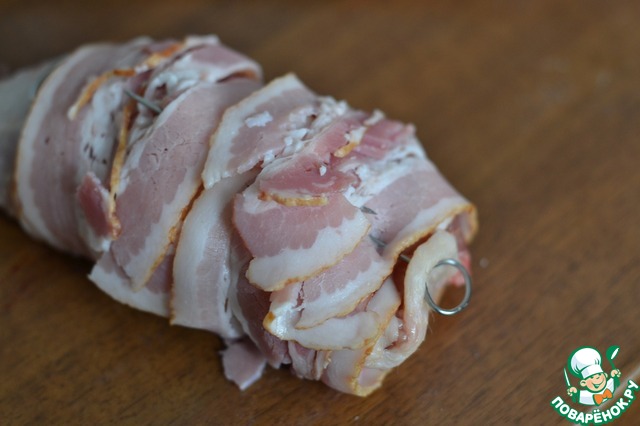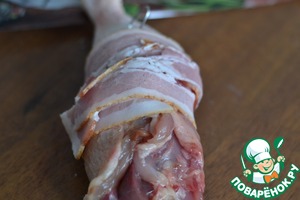 Обернуть беконом ножку до конца и закрепить второй иглой.