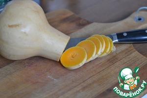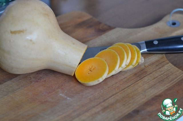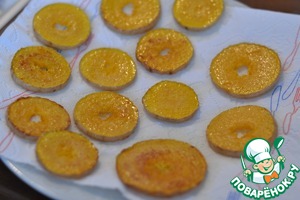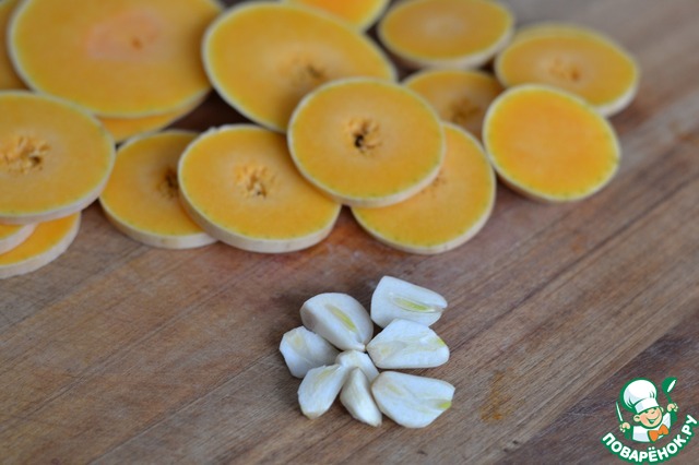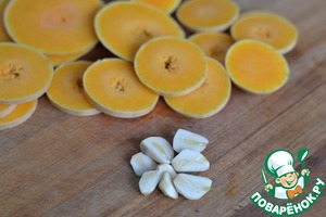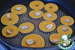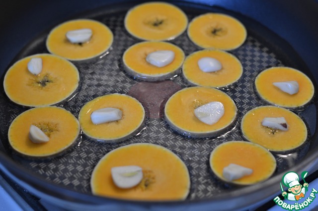 На раскаленном подсолнечном масле обжарим кружочки тыквы, половинки чеснока выкладываем на кружок. Жарим 2 минуты.