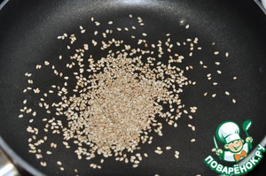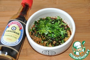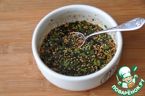 Горячий кунжут высыпаем в соус, чтобы он отдал свой аромат.