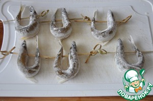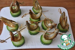 На огурцы зубочистками прикрепляем жареную корюшку.