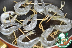 На горячую сковороду наливаем растительное масло. Когда масло нагреется, кладём рыбу на шпажках. Жарим рыбу на среднем огне, крышку не закрываем. Готовим около трёх-пяти минут с каждой стороны до румяной корочки. Хочу заметить, что благодаря шпажкам эту рыбу очень удобно переворачивать. Но это, конечно, возможно при жарке небольшого количества рыбы.