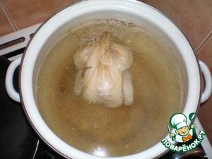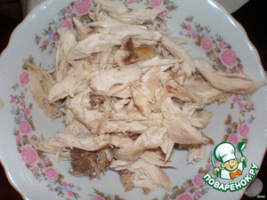 Цыпленка вынуть, остудить, снять кожицу, отделить мясо от костей. Отставить.