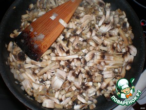 Отдельно обжарить лук до золотистого цвета, затем добавить мелко нарезанные шампиньоны, потушить минут 10.