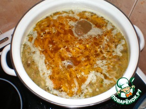 Через мин 10 добавить нарезанный картофель, затем забросить морковь, и лук с шампиньонами. Варить мин 10-15.
