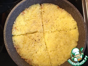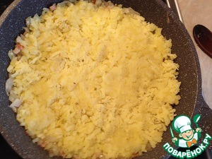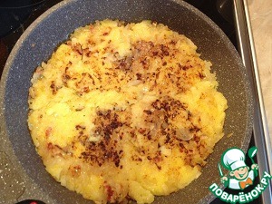 Затем сверху на лук выкладываем картофель. Разравниваем, приминаем ложкой по всей поверхности. Обжариваем минут 5-7 на среднем огне, периодически приминая.