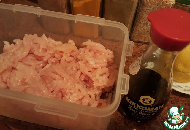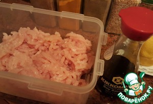 Прокрутить филе куриных грудок в мясорубке с мелкой сеткой. Добавить специи и соевый соус, тщательно вымешать фарш, накрыть и убрать в холодильник на сутки.