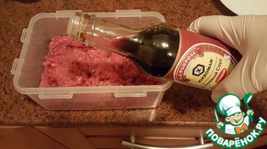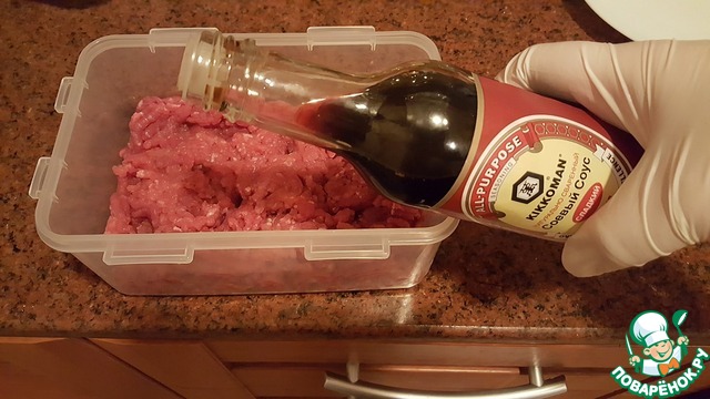 В отдельную ёмкость прокрутить говядину, добавить гранатовый соус и Сладкий соевый соус ТМ Киккоман. Тщательно вымешать фарш, накрыть и убрать в холодильник.