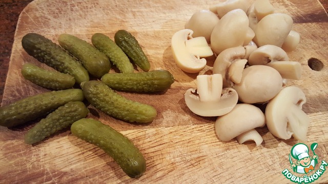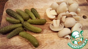 - Шампиньоны (маринованные или отварные, маслины без косточки, маринованные огурцы корнишоны...)