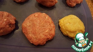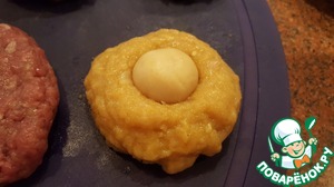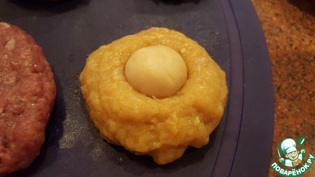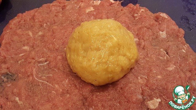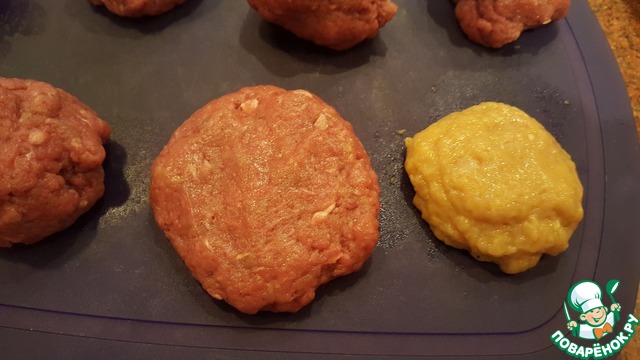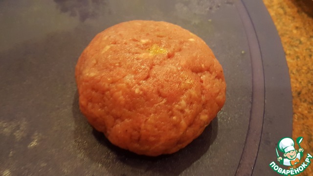 Шарик из говяжьего фарша расплющить в лепёшку, чуть с большей толщиной посередине и тоньше по краям. Выложить куриный шарик в центр.