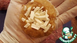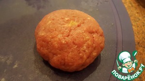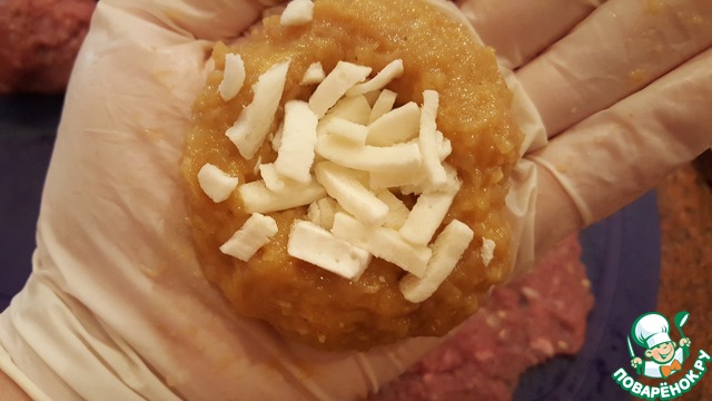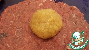 Поместить начинку сюрприз в центр шарика из куриного фарша, чуть утопить и скатать шарик.