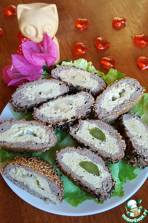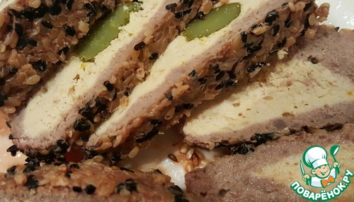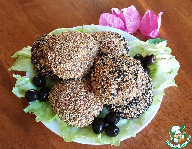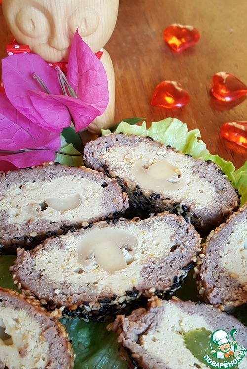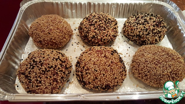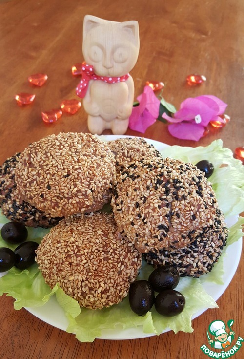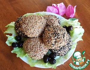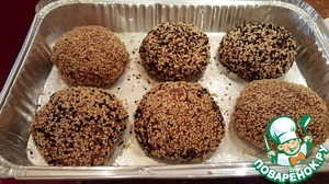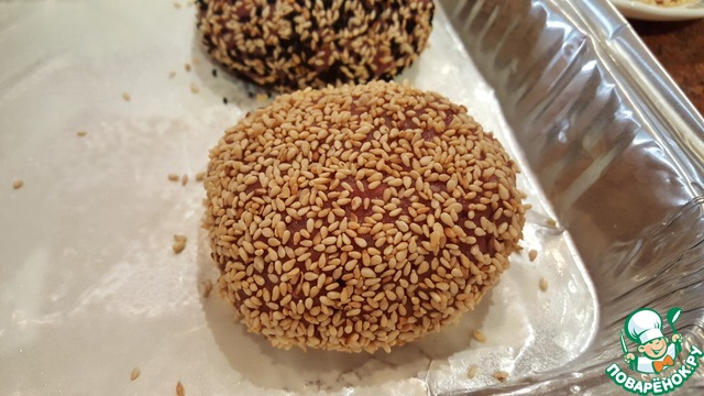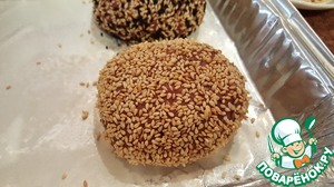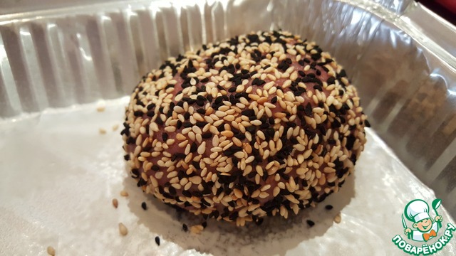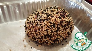 Обвалять шар в кунжуте или панировочных сухарях и выложить в форму для запекания, смазанную маслом. Включить разогрев духовки 200°.