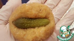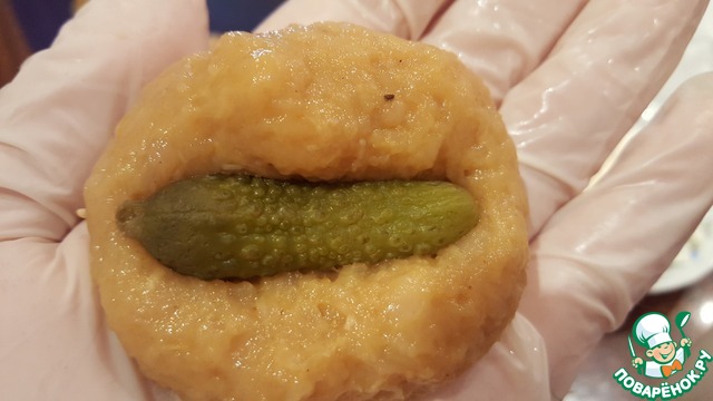 Подготовить сюрпризы. Я хотела использовать ещё маслины, но обнаружила, что у меня в наличие только маслины с косточкой.))) Так что, я использовала три начинки: маринованные шампиньоны, корнишоны, моцарелла.